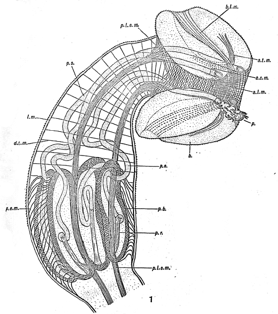 Fig. 1. Grillotia acanthoscolex. Lateral view of scolex showing bothridia, proboscides and musculature.