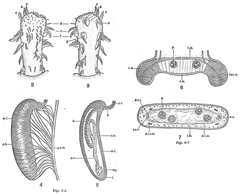 Fig. 2. Grillotia acanthoscolex. Evaginated proboscis showing arrangement of hooks, outer lateral view. Fig. 3. Evaginated proboscis, inner view. Fig. 4. Proboscis bulb with posterior extrinsic muscles. Fig. 5. Proboscis bulb in optical section showing retractor muscle, myoblasts and invaginated apex of proboscis. Fig. 6. Grillotia acanthoscolex. Transverse section of bothridium near anterior end, showing main musculature. Fig. 7. Transverse section of pars vaginalis of scolex.