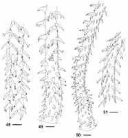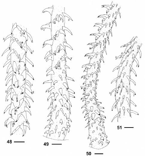 Figs. 4851. Hemionchos mobulae sp. n. from the spiral valve of Mobula japonica. Tentacular armature. Fig. 48. Bothrial surface, metabasal region, beginning six rows anterior to base, external surface on left-hand side. Fig. 49. Bothrial surface, basal and metabasal region, external surface on right-hand side. Fig. 50. External surface, basal and metabasal regions, bothrial surface on left-hand side. Fig. 51. Antibothrial surface, metabasal region, external surface on left-hand side. Scale bars = 0.01 mm.