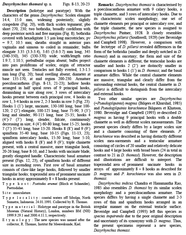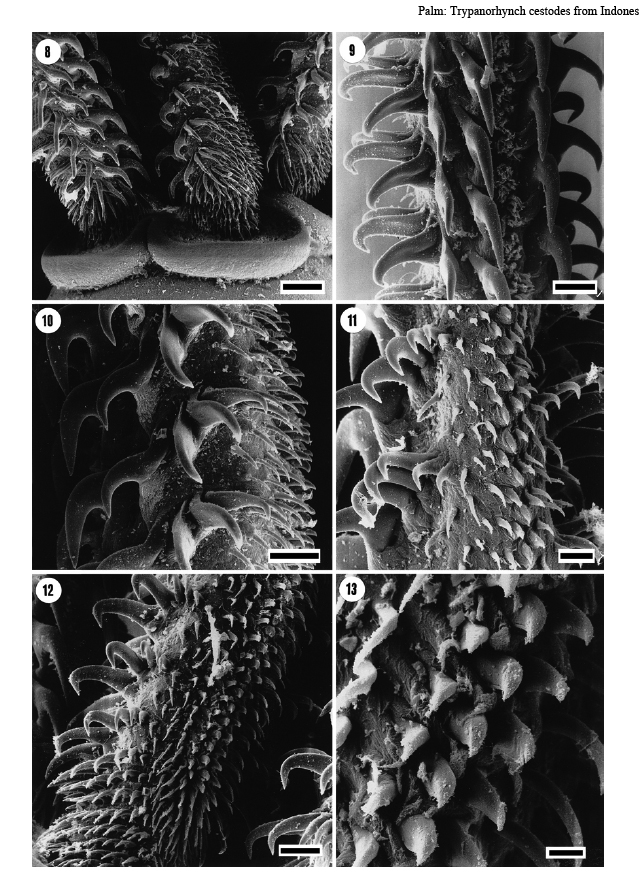 Figs. 8-13. Dasyrhynchus thomasi sp. n. from Psettodes erumei, SEM. Fig. 8. Cordiform bothridia with deep posterior notch and free margins. Fig. 9. Metabasal armature, internal tentacle surface. Fig. 10. Metabasal armature, bothridial tentacle surface. Fig. 11. Metabasal armature, external tentacle surface. Fig. 12. Basal armature, external view. Fig. 13. Triple chainette on external tentacle surface. Scale bars: Fig. 8 = 100 μm; Figs. 9, 10, 12 = 50 μm; Fig. 11 = 20 μm; Fig. 13 = 10 μm.