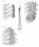 Figs. 20-23. Dasyrhynchus thomasi sp. n. from Psettodes erumei. Fig. 20. Scolex. Fig. 21. Bothridial tentacle surface, metabasal. Fig. 22. Bothridial/external tentacle surface, metabasal. Fig. 23. External tentacle surface, basal and metabasal.