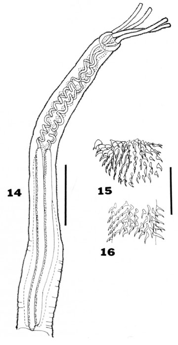 Bars equal 0.05 mm unless otherwise indicated. 14. Eutetrarhynchus litocephalus sp. n. Scolex (bar=1.0). 15. Basal region bothridial surface. 16. Metabasal region internal surface.