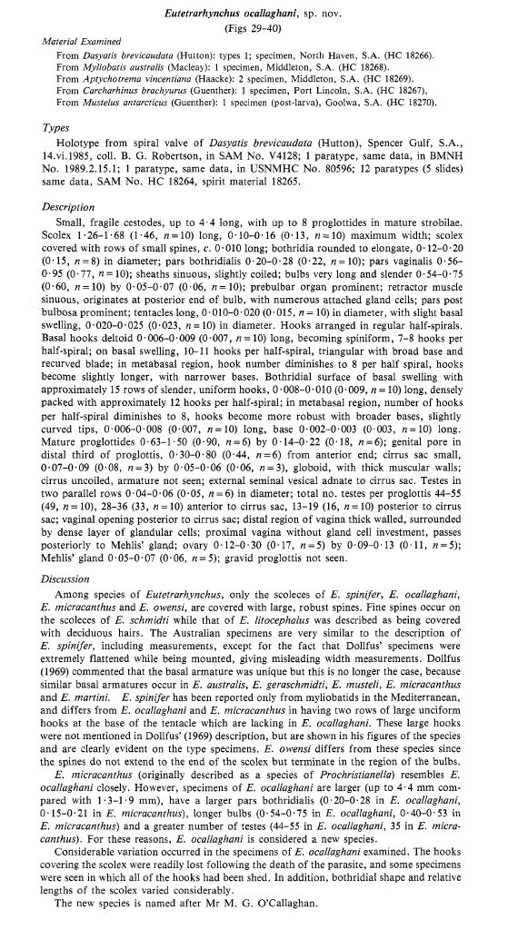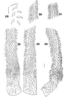 Figs 29-34. Eutetrarhynchus ocallaghani, sp. nov. 29, profiles of hooks of tentacle; 30, metabasal armature, external surface; 31, metabasal armature, bothridial surface; 32, basal armature, internal ... MoreFigs 29-34. Eutetrarhynchus ocallaghani, sp. nov. 29, profiles of hooks of tentacle; 30, metabasal armature, external surface; 31, metabasal armature, bothridial surface; 32, basal armature, internal surface; 33, basal armature, external surface; 34, basal armature, bothridial surface. Scale lines: 0.01 mm. |