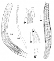 showing sco1ex;spines; 38, mature proglottis; 39, anterior extremity of bulb, showing pre-bulbar organ; 40, scolex spines. Scale lines: Figs 35-39, 0.1 mm; Fig. 40, 0.01 mm. |