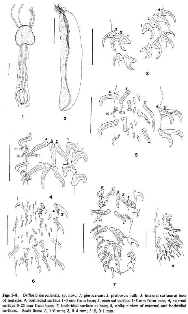 Figs 1-8. Grillotia heroniensis, sp. nov.: I , plerocercus; 2, proboscis bulb; 3, internal surface at base of tentacle; 4, bothridial surface 1.0 mm from base; 5, external surface 1.8 mm from base; 6, external surface 0.25 mm from base; 7, bothridial surface at base; 8, oblique view of external and bothridial surfaces. Scale lines: I, 1.0 mm; 2, 0.4 mm; 3-8, 0.1 mm.
