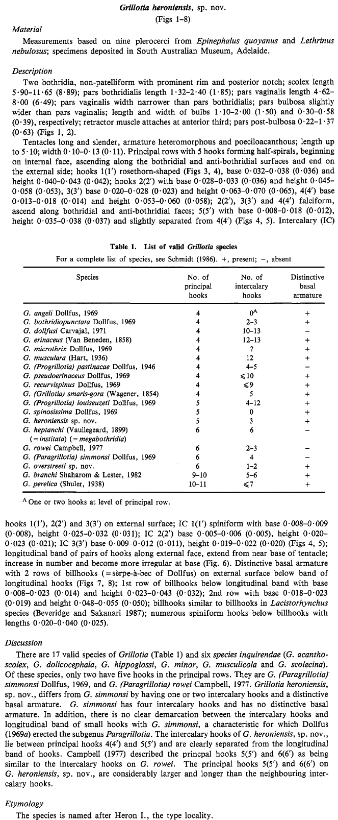 Sakanari, J.. 1989. Grillotia heroniensis, sp. nov., and G. overstreeti, sp. nov., (Cestoda: Trypanorhyncha) from Great Barrier Reef fishes. Australian Journal of Zoology 37: 81-87. (4346) Download PDF |