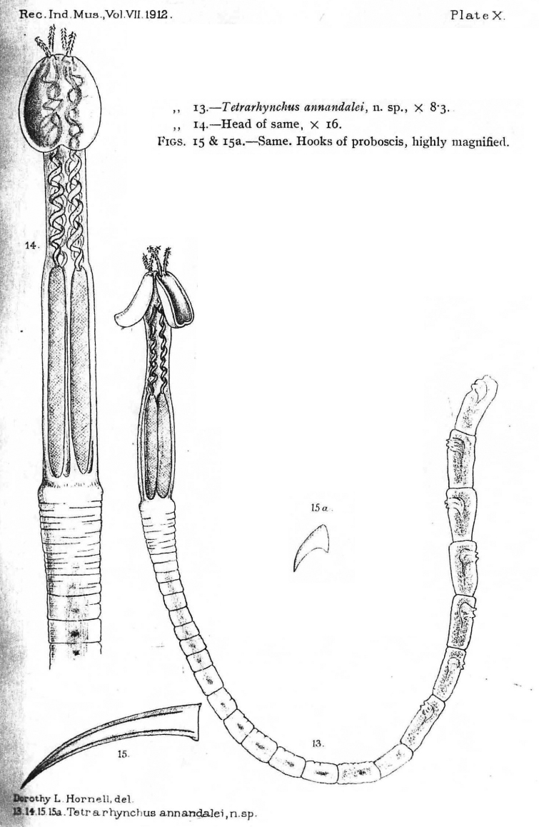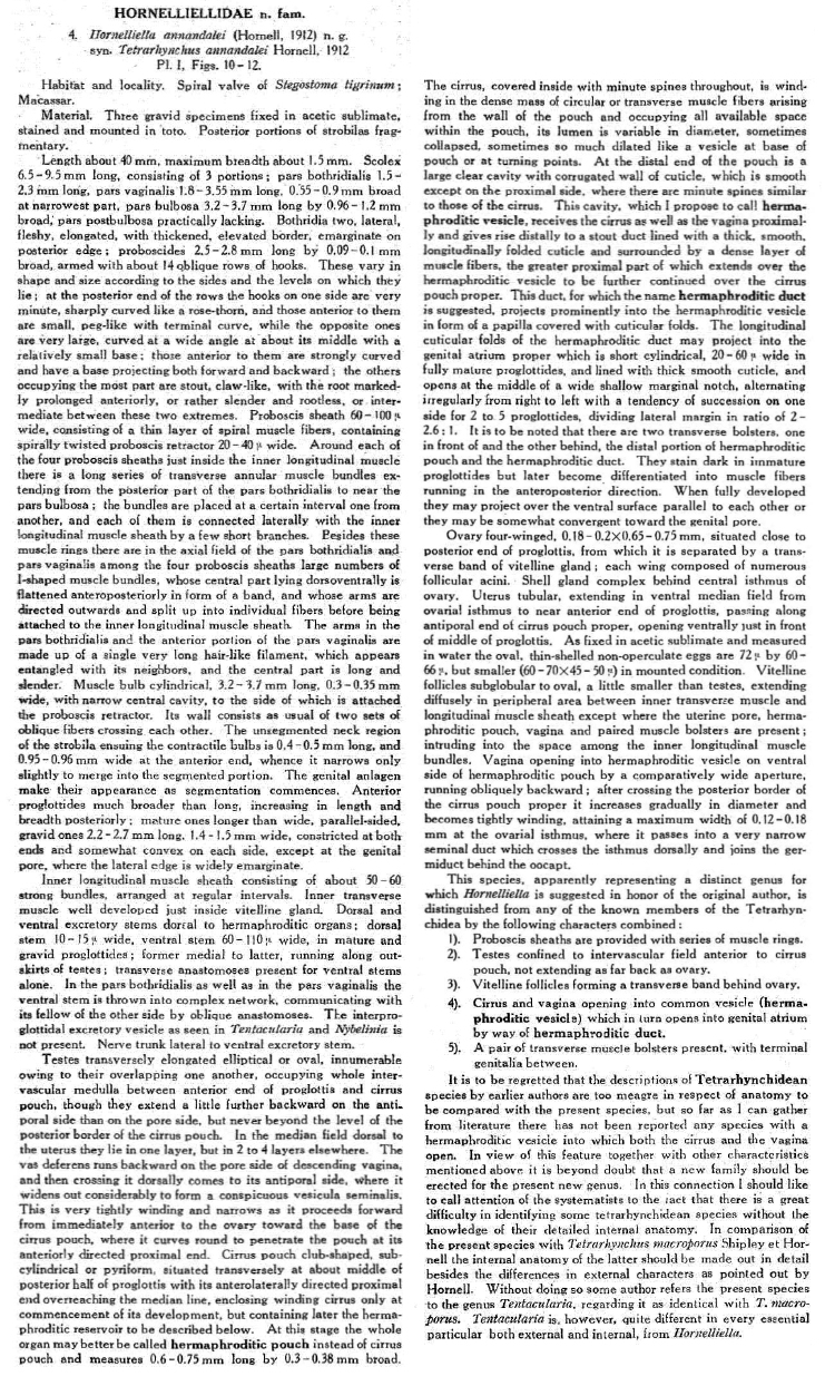 | Synonyms | Tetrarhynchus annandalei Hornell, 1912, pp. 201–4, figures 13, 15; Southwell, 1924, p. 475 (as syn. of Rhynchobothrium erinaceus (van Beneden, 1858)); Tentacularia macropora (Shipley & Hornell, 1906) sensu Southwell, 1929, pp. 215–9, figures 5–6; H. annandalei (Hornell, 1912) Yamaguti, 1954, pp. 362–6, figures 10–12; Hornelliella macropora (Shipley & Hornell, 1906) sensu Campbell & Beveridge, 1987, pp. 197–200, figures 1–11. |