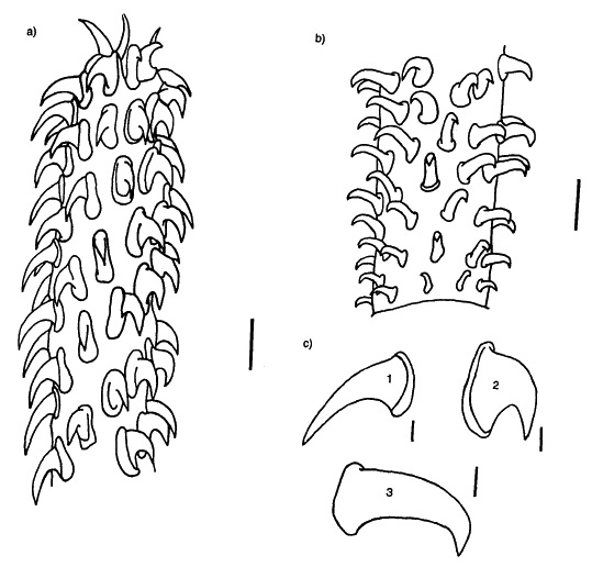 Fig. 3: Nybelinia beverigei sp. nov. (a) tentacle metabasal (Rows 15-21), external surface, antibothridial on right hand and bothridial on left hand side. (c) profile of metabasal hook, bothridial (1), andtibothridial (2), profile of basal hook (3). Scale bar: (a,b) = 50 µm, (c) = 10 µm
