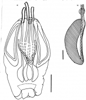 Fig. 2: Nybelinia beveridgei sp. nov.- (a) scolex, (b) bulb with retractor muscle and muscular ring around the basal part of the tentacle sheath. Scale bar: (a) = 1mm, (b) = 200 µm