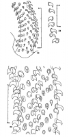 Fig. 35. – N. eureia, n. sp. Crochets de la face bothridiale de la 1 trompe d’une postlarve trouvée chez Mustelus canis (S. L. Mitchill. 1815). On remarquera que du côté gauche de la trompe, les crochets sont plus brusquement courbés que du côté droit.