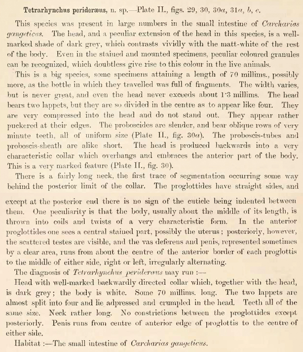 Shipley, A. E. and J. Hornell. 1906. Report on the cestode and nematode parasites from the marine fishes of Ceylon. Report to the Government of Ceylon on the Pearl Oyster Fisheries of the Gulf of Manaar (Herdman), Part 5 5: 43-96. (431) Download PDFDollfus, R.-P. 1930. Sur les Tetrarhynques (2e Contribution) (Dibothriorhynchus, Sphyriocephala, Tentacularia, Nybelinia). Memoires de la Societe Zoologique de France 29: 139-216. (4414) Download PDF |