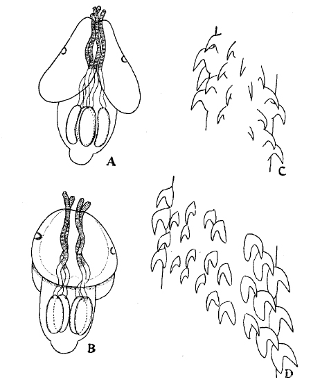 Fig. 50. - Otobothrium balli n. sp. A - larva, lateral view. B - larva, dorso-ventral view x 35. C.D. - proboscis hooks x 500 (Orig.).