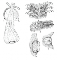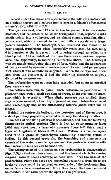 Plate VI. Otobothrium dipsacum, new species, from Pomatomus saltatrix. 1. Embryo removed from blastocyst. a, ciliated organs of bothria (shown enlarged in figs. 4,5). Enlarged twenty-seven times. 2. Two transverse rows of hooks on proboscis. Enlarged three hundred times. 3. Obverse side of proboscis from that shown in fig. 2. 4. Ciliated organs (rudimentary sense organs) of bothria. Enlarged two hundred and twenty-five times. 5. The same invaginated.