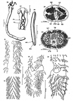 Text-Fig 4- Prochristianella aetobatidis n. sp. 26, Entire worm 27, Pars bothridialis and pars vaginalis 28, Detached muscular bulb 29, T S at level of ovary 30, T S posterior to cirrus pouch 31, Internal surface of proboscide 32, External surface near distal extremity of proboscide 33, Internal surface of basal region 34, External surface of basal region Corrigenda the scales in Figures 29-34 should read 0 1 mm