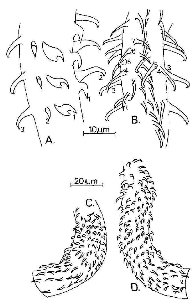 Figure 12. Tentacle of Renibulbus penaeus gen. n., sp. n. A, B. Metabasal armature: A, internal