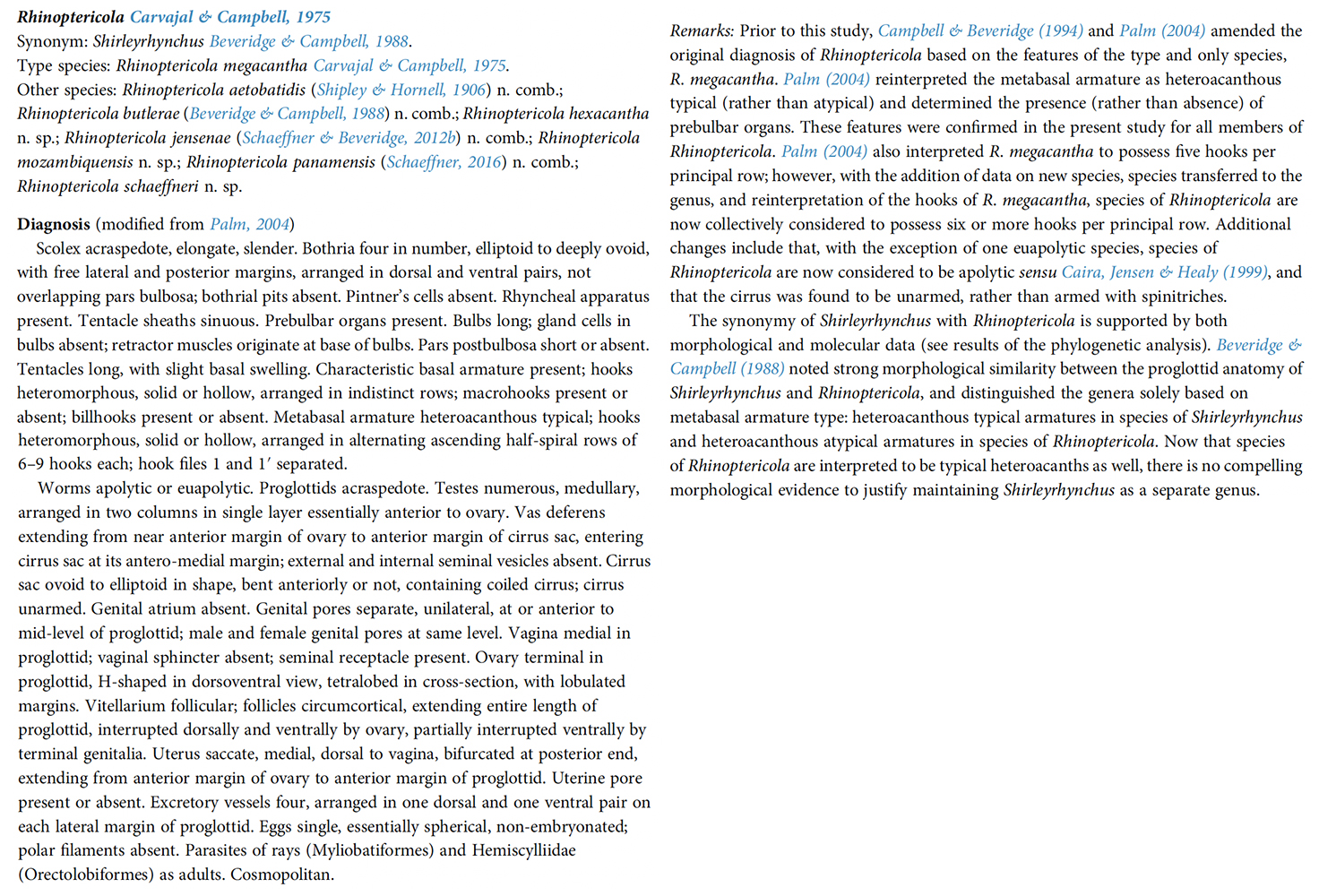 Herzog, K. S. and K. Jensen. 2022. A synergistic, global approach to revising the trypanorhynch tapeworm family Rhinoptericolidae (Trypanobatoida). PeerJ Life & Environment 10:e12865: 83 pp. (7426) Download PDF |