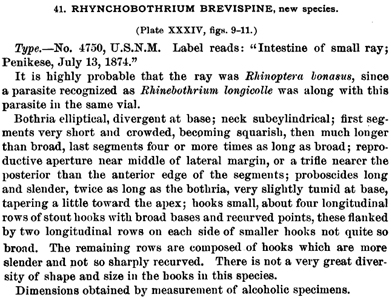 | Host Notes | "Label reads 'Intestine of a small ray' Penikese, July 13, 1874.' It is highly probable that the ray was Rhinoptera bonasus, since a parasite recognized as Rhinebothrium longicolle was along with this parasite in the same vial." (Linton, 1897, pg. 450) |