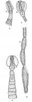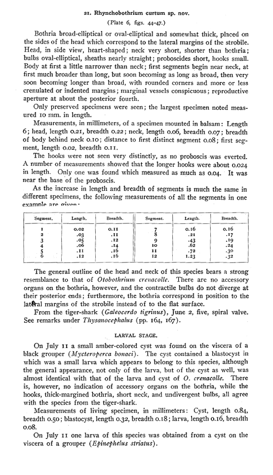 Plate 6. Rhynchobothrium curtum sp. nov., from Galeocerdo tigrinus. 44. Head, neck, and anterior part of strobile, alcoholic, showing marginal view of bothrium; length of head 0.20 mm. 45. Lateral view of bothrium, and anterior end of strobile, alcoholic; length of bothrium 0.19 mm. 46. Same view of another specimen mounted in balsam; length of bothrium 0.19 mm. 47. Last segments of strobile mounted in balsam; breadth of last segment 0.33 mm. Abbreviations: b. Muscular bulbs, whose use is to evert the proboscides by pressure on fluid with which they are filled; l. v. Lateral vessel;
