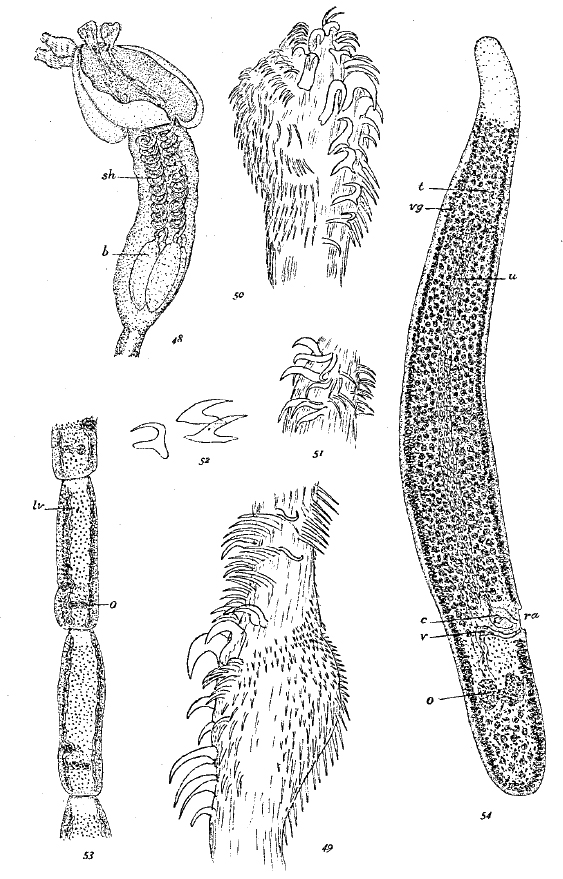 Plate 7. Rhynchobothrium exile sp. nov., from Galeocerdo tigrinus. 48. Head and neck sketched from alcoholic specimens; diameter of neck, anterior, 0.28 mm. 49. Base of proboscis; diameter of enlargement, exclusive of hooks, 0.07 mm. 50. Another view of base of proboscis; diameter of enlargement, exclusive of hooks, 0.07 mm. 51. Another view of proboscis; diameter, exclusive of hooks, 0.031 mm. 52. Types of hooks; length 0.020 to 0.028 mm. 53. Segments near posterior end of strobile; maximum diameter 0.35 mm. 54. Free segment, partly diagrammatic. Testes represented a little larger than natural; vitelline glands partly cover testes in nature; length 5.5 mm. Abbreviations: b. Muscular bulbs, whose use is to evert the proboscides by pressure on fluid with which they are filled; c. Cirrus; l. v. Lateral vessel; o. Ovary; r. a. Reproductive aperture; sh. Proboscis sheath; t. Testes; u. Uterus; v. Vagina; v. g. Vitelline glands.