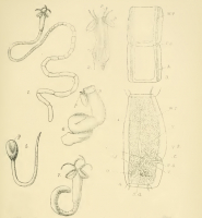 Explanation of Plate IV. Fig. 1. - Rhynchobothrius ilisha, n. sp. Whole worm. Fig. 2. - Head of the same showing its internal anatomy. Fig. 3. - Two proglottids of the same showing the excretory, water vascular and nervous systems. Fig. 4. - Anatomy of a proglottid of the same. 5. - Cyst of R. ilisha from the lateral muscles of Hilsa. Fig. 6. - Young of R. ilisha dissected out of the cyst. Fig. 7. - Young individual of R. ilisha from the stomach of the shark.
