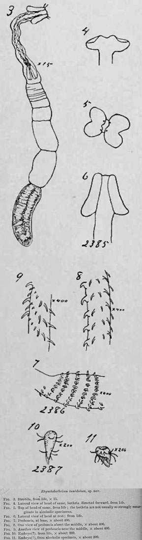 Plate XI. Figs. 3-11. Rhynchobothrium tumidulum sp. nov. Fig. 3. Strobile, from life, x15. Fig. 4. Lateral view of head of same, bothria directed forward, from life. Fig. 5. Top of head of same, from life; the bothria are not usually so strongly emarginate in alcoholic specimens. Fig. 6. Lateral view of head at rest; from life. Fig. 7. Proboscis, at base, x about 400. Fig. 8. One view of proboscis about the middle, x about 400. Fig. 9. Another view of proboscis near the middle, x about 400. Fig. 10. Embryo(?), from life, x about 200. Fig. 11. Embryo(?), from alcoholic specimen, x about 200.