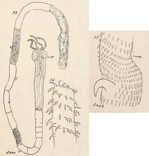 Plate XII. Figs. 10-12. Rhynchobothrium wageneri, sp. nov. Fig. 10. Strobile, outline from life, details of last segment filled in from alcoholic specimen, x18. Fig. 11. Base of proboscis, showing the arrangement and relatives sizes of the basal hooks and the single large hook. The latter lies on the outer side of the proboscis as shown in Fig. 10, x about 400. Fig. 12. Proboscis near apex, x about 400.