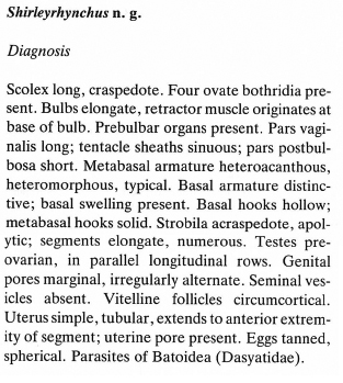 Beveridge, I. and R. A. Campbell. 1988. Cetorhinicola n.g., Shirleyrhynchus n.g. and Stragulorhynchus n.g., three new genera of trypanorhynch cestodes from elasmobranchs in Australian waters. Systematic Parasitology 12: 47-60.
