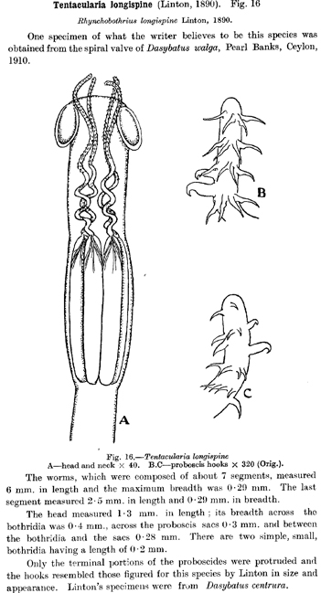 Linton, E. 1890. Notes on Entozoa of marine fishes of New England, with descriptions of several new species. Part II. United States Commision of Fish and Fisheries. Part XV. Report of the Commissioner for 1887 15: 718-899. (1011) Download PDFSouthwell, T. 1929. A monograph on cestodes of the order Trypanorhyncha from Ceylon and India. Part I. Ceylon Journal of Science. Section B. Zoology and Geology 15: 169-312. (446) Download PDF |