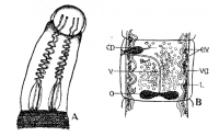 Fig. 21. - Tentacularia obesa. A - head and neck x 30. B - mature segment x 33 (Orig.).