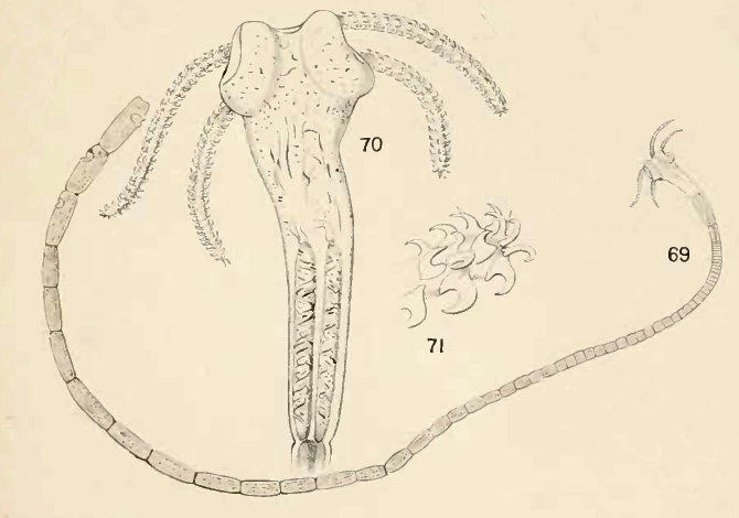 Plate IV. Fig. 69. Tetrarhynchus rhynchobatidis. x4. Fig. 70. The head of the same. x about 18. Fig. 71. End of a proboscis of the same, x about 100, showing the curiously reversed teeth.