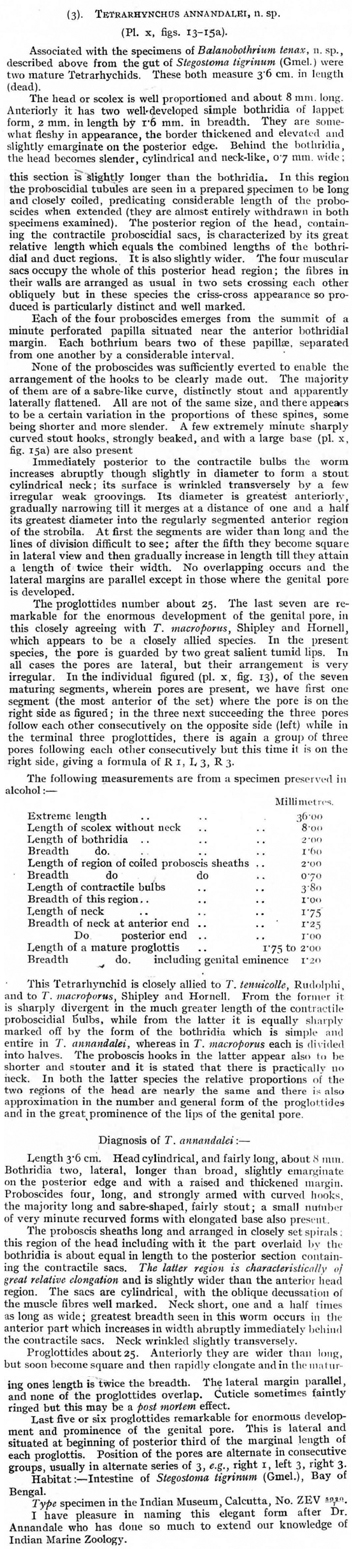 | Synonyms | Tetrarhynchus annandalei Hornell, 1912, pp. 201–4, figures 13, 15; Southwell, 1924, p. 475 (as syn. of Rhynchobothrium erinaceus (van Beneden, 1858)); Tentacularia macropora (Shipley & Hornell, 1906) sensu Southwell, 1929, pp. 215–9, figures 5–6; H. annandalei (Hornell, 1912) Yamaguti, 1954, pp. 362–6, figures 10–12; Hornelliella macropora (Shipley & Hornell, 1906) sensu Campbell & Beveridge, 1987, pp. 197–200, figures 1–11. |