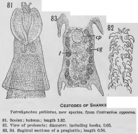 Plate 8. Tetrarhynchus palliatus, new species, from Cestracion zygaena. 81. Scolex; balsam; length 1.82. 82. View of proboscis; diameter, including hooks, 0.05. 83, 84. Saggital sections of a proglottis; length 0.56.