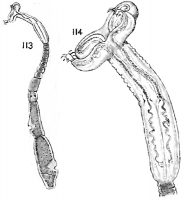 Fig. 113. Tetrarhynchus platycephalus. x10. 114. Head of the same. x45.