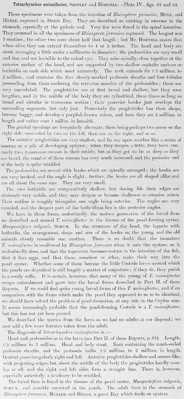 This species has a complicated taxonomic history. The name "Tetrarhynchus unionifactor" first appears in the literature in a letter to the editor wirtten by W.A. Herdman and published in the 1903 volume of Nature (citation #7036). Here, Herdman transcribes part of a letter he received from J. Hornell: "Just a line to tell you that I have found the final host of Tetrarhynchus unionifactor ". In a footnote, Herman clarifies that Tetrarhynchus unionifactor is "the name we gave to this Tetrarhynchus larva in our notes and letters until it was ascertained whether the species is known or new". Herdman concludes the letter to the editor by saying "Mr. Arthur Shipley, who is writing a joint paper with Mr. Hornell...will no doubt discuss the matter fully later on...". In a 1903 report on the proceedings of the British Association for the Advancement of Science, a summary of a paper read on pearl formation in Ceylon by Herdman and Hornell is given, which states "The parasite in the case of the majority of the cyst-pearls of Ceylon is the larva of a Cestode which appears to be new, and will be described under the name Tetrarhynchus unionifactor". Then, in 1904, Shipley and Hornell formally describe Tetrarhynchus unionifactor as larve from the pearl oyster (citation #429). Even though this 1904 description is not the first usage of the name in the literature, it is the first time the species is formally described, and thus Shipley & Hornell (1904) should be considered the authority of the name "Tetrarhynchus unionifactor". In 1906, Shipley & Hornell (citation #431) recovered adults of what they consider to also be Tetrarhynchus unionifactor from the stomach and intestines of Rhinoptera javanica, and therein ammend their original description of Tetrarhynchus unionifactor to include the features of the adult worms. In 1929, Southwell (citation #446) creates the new combination "Tentacularia unionifactor" and lists as a synonym "Tetrarhynchus unionifactor Shipley & Hornell, 1904". He cites the ammended description from Shipley & Hornell (1906), and concludes by saying "It is not possible to identify the parasite from the above description...It is almost certain that the larval forms named T. unionfactor, Shipley and Hornell, 1904, from Margaritifera vulgaris belong to the genus Tylocephalum, Linton, 1890.". Thus, it appears that Southwell (1929) considered the adults from Rhioptera javanica to belong to the trypanorhynch genus Tentacularia, and the larvae from Margaritifera vulgaris to be a separate species belonging to the lecanicephalidean genus to Tylocephalum. This may be the first usage of the combination "Tylocephalum unionifactor". In his keys to cestodes, Schmidt (1986) (citation #660) considers Tylocephalum unionifactor to belong to the genus Lecanicephalum, creating the new combination "Lecanicephlaum unionifactor". He cites the authority for the name "Tylocephalum unionifactor" as "Herdmann et Hornell 1903"; however, this publication does not exist. Schmidt may have been refering to the publication "Pearl Production" by Herdman & Hornell (1904) (included in citation #556), a 42-page report which mentions Tetrarhynchus unionifactor, or may have been referring to one of the two earlier usages of the name in the literature from 1903 mentioned above. In their rededscription of the species in 1988, Beveridge & Campbell (citation #4283) move the species to the genus Tetrarhynchobothrium and also express doubt that the larve from the pearl oyster and the adults from R. javanica are conspecific: "...the type (larval) specimen cannot therefore be identified, with absolute certainty, with any of the species whose segment anatomy is known. Whether Shipley & Hornell's (1906) specimens from R. javanica belong to T. unionifactor or not cannot at present be decided from the types, although Pintner (1931a) decided that they do not. The adults do appear to represent a distinct species, and it seems reasonable to utilise the name unionifactor for them until further detailed studies can be made on new material from the type-locality.". |