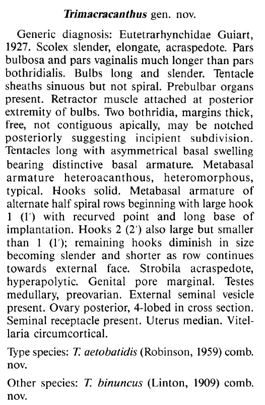 | Type Species | Trimacracanthus aetobatidis (Robinson, 1959) |