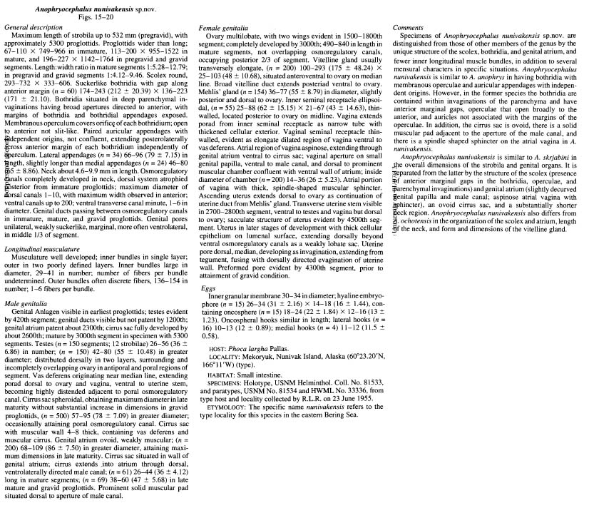 Hoberg, E. P., M. A. Adams, and R. L. Rausch. 1991. Revision of the genus Anophryocephalus Baylis, 1922 from pinnipeds in the Holarctic with descriptions of Anophryocephalus nunivakensis sp. n. and A. eumetopii sp. n. (Tetrabothriidae) and evaluation of host records from the Phocidae. Canadian Journal of Zoology 69: 1653-1668.