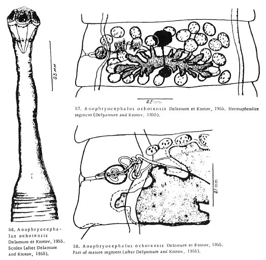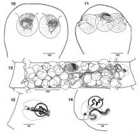 FIGS. 10- 14. Anophryocephalus ochotensis. Fig. 10. Scolex, showing morph in which the bothridia are oriented dorsally and ventrally. Fig. 11. Scolex, showing morph in which bothridia are oriented laterally dorsally and ventrally. Fig. 12. Mature proglottid, dorsal view. Fig. 13. Genital atrium, cirrus sac, and spinose atrial portion of vagina, ventral view; note ventrally directed genital pore. Fig. 14. Genital atrium, transverse section, view from anterior. All scale bars are in rnicrometres.