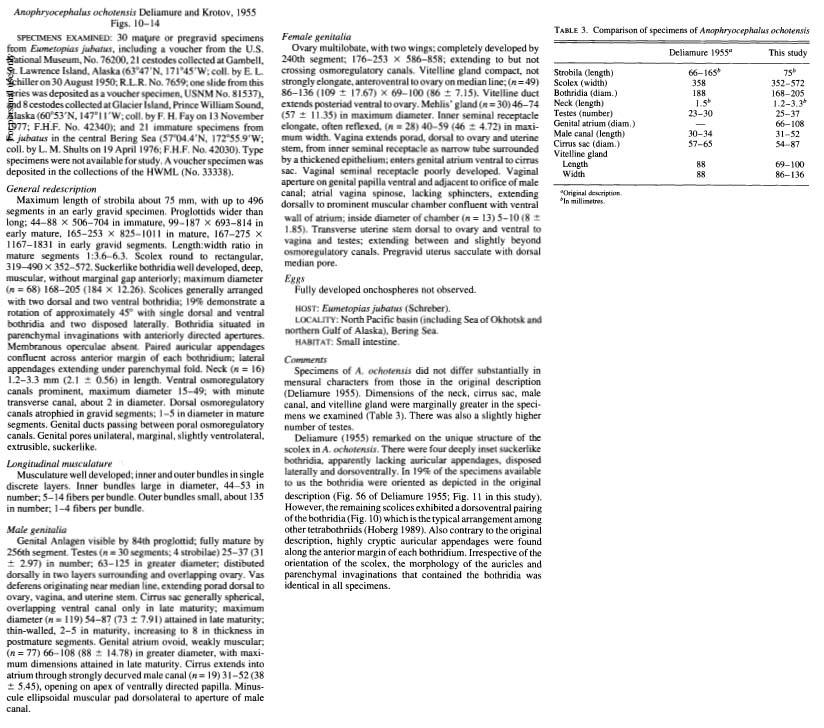 Hoberg, E. P., M. A. Adams, and R. L. Rausch. 1991. Revision of the genus Anophryocephalus Baylis, 1922 from pinnipeds in the Holarctic with descriptions of Anophryocephalus nunivakensis sp. n. and A. eumetopii sp. n. (Tetrabothriidae) and evaluation of host records from the Phocidae. Canadian Journal of Zoology 69: 1653-1668. (4221) Download PDF |