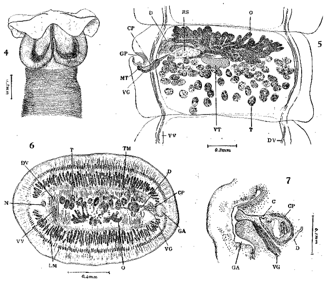 Figs. 4-7. Paratetrabothrius orientalis n. g., n. sp. Fig. 4. Scolex, ventral view. Fig. 5. Mature proglottis, ventral view. Fig. 6. Transverse section of immature proglottis. Fig. 7. Transverse section of mature proglottis through cirrus pouch and vagina.