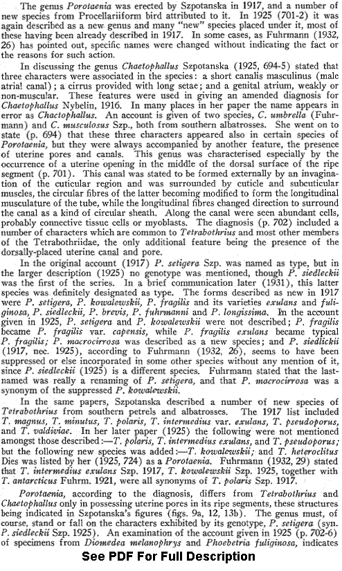 Szpotanska, I. 1917. Un nouveau genre, sous-genre et quelques nouvelles especes de la famille Tetrabothriidae. Sprawozdania z posiedzen wydzialu 10: 909-918. (4240) Download PDF |