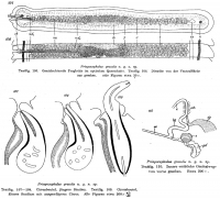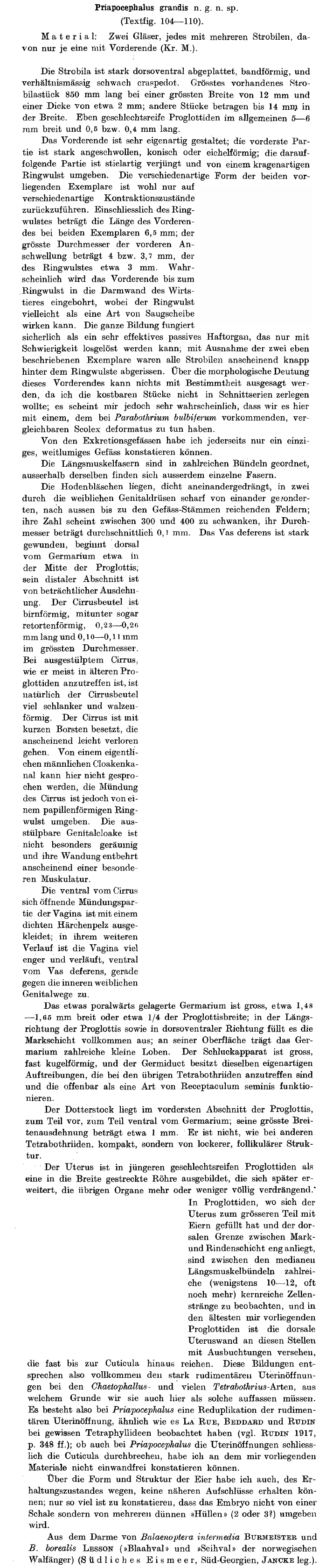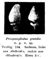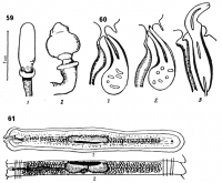 59. Priapocephalus grandis Nybelin, 1922. Scolex (1 - after Baylis, 1926; 2 - after Joyeux and Baer, 1936). 60. Priapocephalus grandis Nybelin, 1922. 1,2 - unformed bursa; 3 - formed bursa (sections, after Nybelin, 1922).