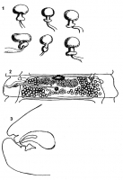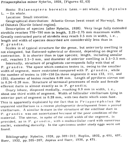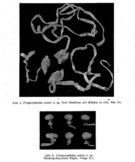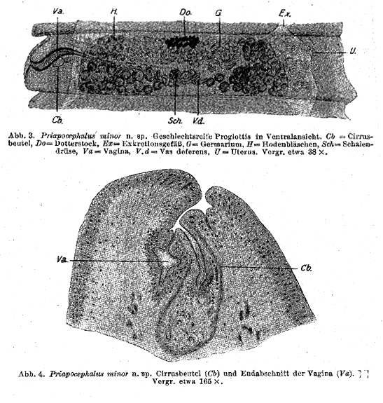 1. Priapocephalus minor Nybelin, 1928. Scoleces (after Nybelin, 1928). 2. Priapocephalus minor Nybelin, 1928. Hermaphrodite segment. 3. Priapocephalus minor Nybelin, 1928. Part of transverse section of segment (after Nybelin, 1928).