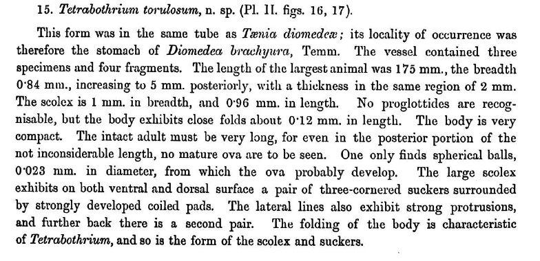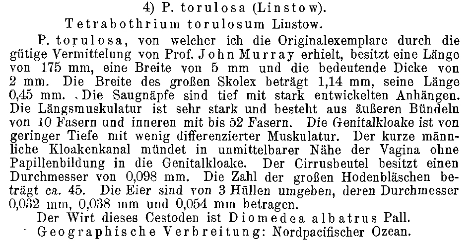 Linstow, O. F. B., von. 1888. Report on the Entozoa collected by H. M. S. Challenger during the years 1873-76. The Voyage of the H. M. S. Challenger. Reports of the Scientific Results of the Challenger Expedition, Zoology, Edinburgh 23: 18-Jan. (4228) Download PDFFuhrmann, O. 1899. Das Genus Prosthecocotyle. Centralblatt fur Bakteriologie 25: 863-877. (4212) Download PDF |