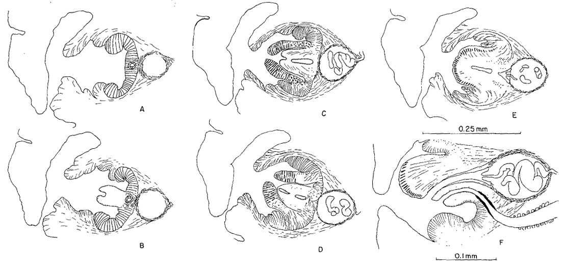 Figure 1. Tetrabothrius bairdi sp. nov. Genital atirum and cirrus-sac at different levels to show structure of the genital papilla: horizontal sections: A, most ventral, through atrium below papilla; B, C, D, successive levels through papilla containing male atrial canal and vagina and showing muscular fold on either side; E, through upper region. In F the corresponding region is reconstructed from photographs of transverse sections.