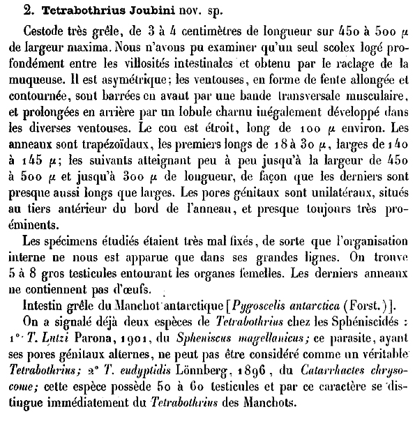 Railliet, A. and A. Henry. 1912. Helminthes recueillis par L'Expédition Antarctique Française du Pourquoi-Pas. I. Cestodes d'Oiseaux. Bulletin du Muséum national d'histoire naturelle 18: 35-39. (6701) Download PDF |
