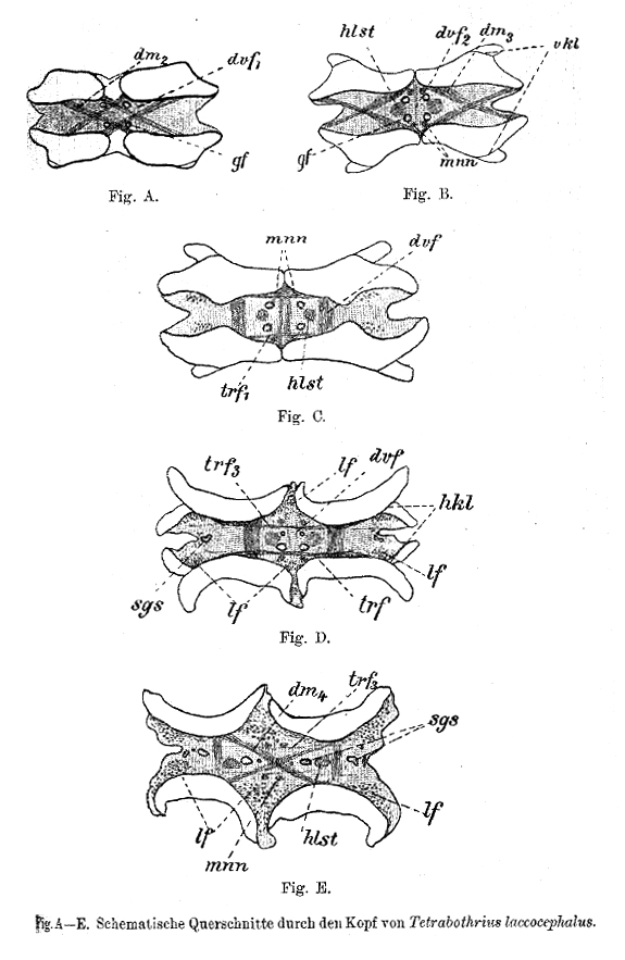 Fig. A-E. Schematische Querschnitte durch den Kopf von Tetrabothrius laccocephalus.