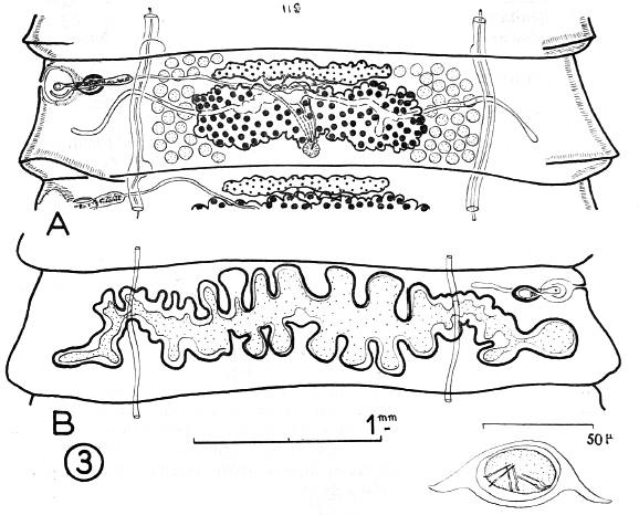 Fig. 3. - T. mozambiquus n. sp. A) anneau mûr, vue ventrale. B) anneau gravide, vue dorsale et un aeuf.