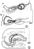 Fig. 1. - Tetrabothrius mozambiquus n. sp. - Atrium génital. A) vue dorsale, cirre invaginé; B) vue ventrale, cirre évaginé. Fig. 2. - T. mozambiquus n. sp. - Atrium génital. Coupe transversale. Face ventrale en haut.