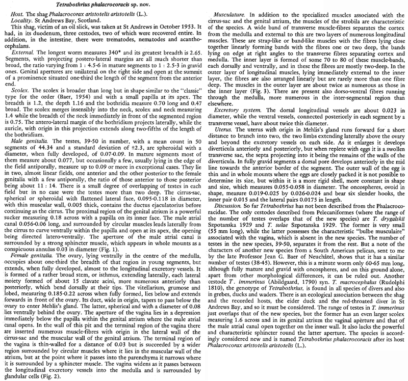 Burt, D. R. R. 1977. On a new species of tetrabothriid cestode from the shag Phalacrocorax aristotelis aristotelis (L.). Zoological Journal of the Linnean Society of London 60: 391-395. (4206) Download PDF |