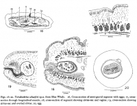Figs. 16-20. Tetrabothrius schaeferi sp.n. from Blue Whale. 16, Cross-section of semi-gravid segment with eggs; 17, cross-section through longitudinal muscle; 18, cross-section of segment showing cirrus-sac and vagina; 19, cross-section showing cirrus-sac and everted cirrus; 20, egg.
